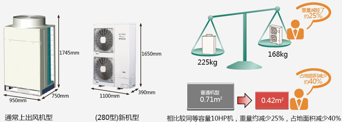 室外機(jī)組采用側(cè)出口空氣小型化、輕量化設(shè)計(jì),型號尺寸為1650(H)×1100(W)×390(D),與同容量的普通產(chǎn)品相比,大大減少了占用面積和重量。